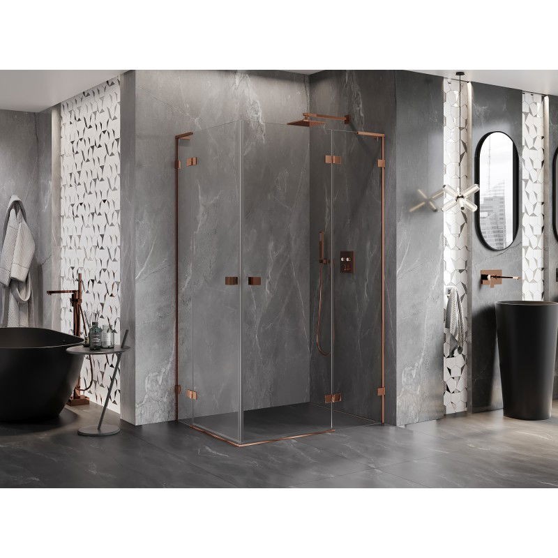 Specifikace produktu: Rozměr: 105x70 cm (pravé dveře 105 cm, levé dveře 70 cm) Výška: 200 cm Strana montáže: Pravá Vchod: Dveře s výklopnými křídly Barva skla: Průhledná Povrchová úprava: Růžové zlato Profil: Hliník Stabilizátor ve tvaru L: Nerezová ocel Typ skla: Tvrzené Tloušťka skla: 8 mm Povrchová úprava pro snadné čištění Možnost nastavení šířky Dva montážní systémy: - S profilem, který umožňuje vyrovnání nerovností stěn - Bez profilu pro dokonale rovné stěny Možnost montáže na sprchovou vaničku nebo dlaždice Mechanismus pro zvedání a spouštění dveří Mosazné svorky a panty v jedné rovině se skleněnou tabulí Magnetický proužek a elastomerové těsnění pro odvod vody Hliníkový práh těsnění dveří