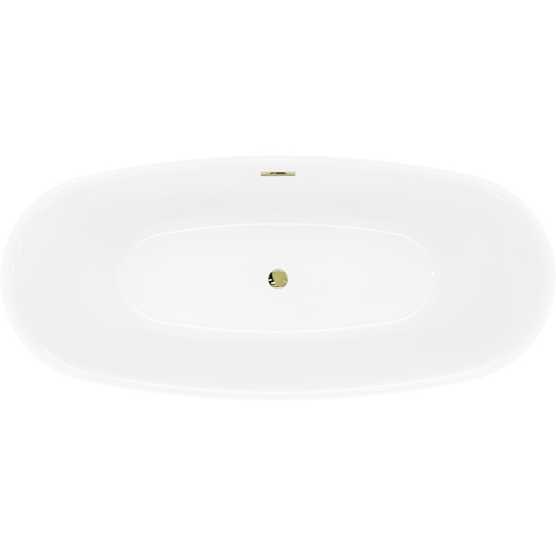 Specifikace produktu: Rozměry: 170 x 75 cm Výška: 58 cm Hloubka: 45 cm Instalace: Volně stojící Materiál: Sanitární akrylát Barva: Bílá/Černá Povrchová úprava: Zlatá Otvor pro přepad: Ano Otvor pro baterii: Ne Sifon a zátka click-clack jsou součástí balení Odolné vůči baterii a UV záření