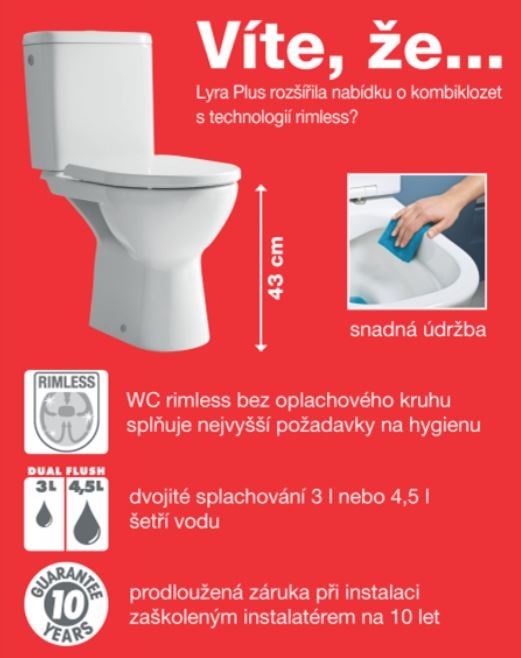 WC kombi RIMLESS /bez splachovacího kruhu/ = je moderní systém splachování, který se charakterizuje znamenitou funkčností a vysokou hygienou oproti běžným klozetům se splachovacím kruhem. U běžných klozetů může docházet k zachycování nečistot ve splachovacím kruhu pod okrajem mísy. Současný systém zajišťuje dokonalý rozvod vody a jednoduché čištění - veškerý prostor uvnitř mísy je smaltovaný a jednoduše čistitelný.
