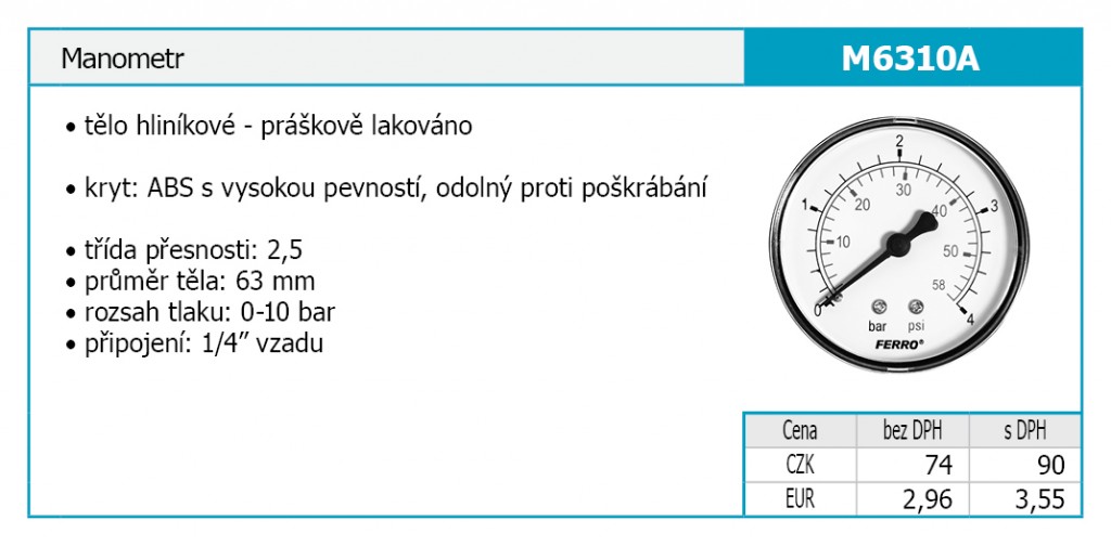 Manometr axiální• Tělo hliníkové - práškově lakováno• Kryt: ABS s vysokou pevností, odolný proti poškrábání• třída přesnosti: 2,5• průměr těla: 63 mm• rozsah tlaku: 0-10 bar• připojení: 1/4” vzadu