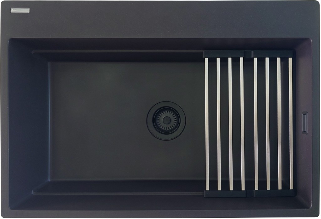 Dřez je vyroben z kvalitního granitu obohaceného o ionty stříbra, což mu propůjčuje antiseptické vlastnosti. Matný povrch v odstínu Nero dodává kuchyni moderní a sofistikovaný vzhled. Materiál zajišťuje vysokou odolnost proti nárazům, vysokým teplotám až do 250 °C, změnám barvy a tepelným šokům. Hydrofobní vlastnosti povrchu odpuzují vodu, což usnadňuje čištění a udržuje dřez hygienicky čistý.