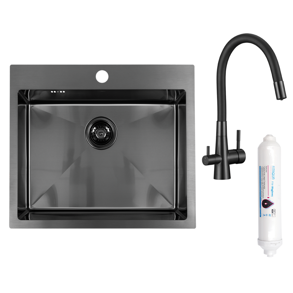 Součástí dřezu je kuchyňská baterie Riveco s uhlíkovým filtrem, která zajišťuje přístup k filtrované vodě bez nutnosti použití plastových lahví. Díky dvojité páce umožňuje snadné a oddělené ovládání běžné a filtrované vody, čímž přispívá k pohodlí i ekologickému provozu v kuchyni.