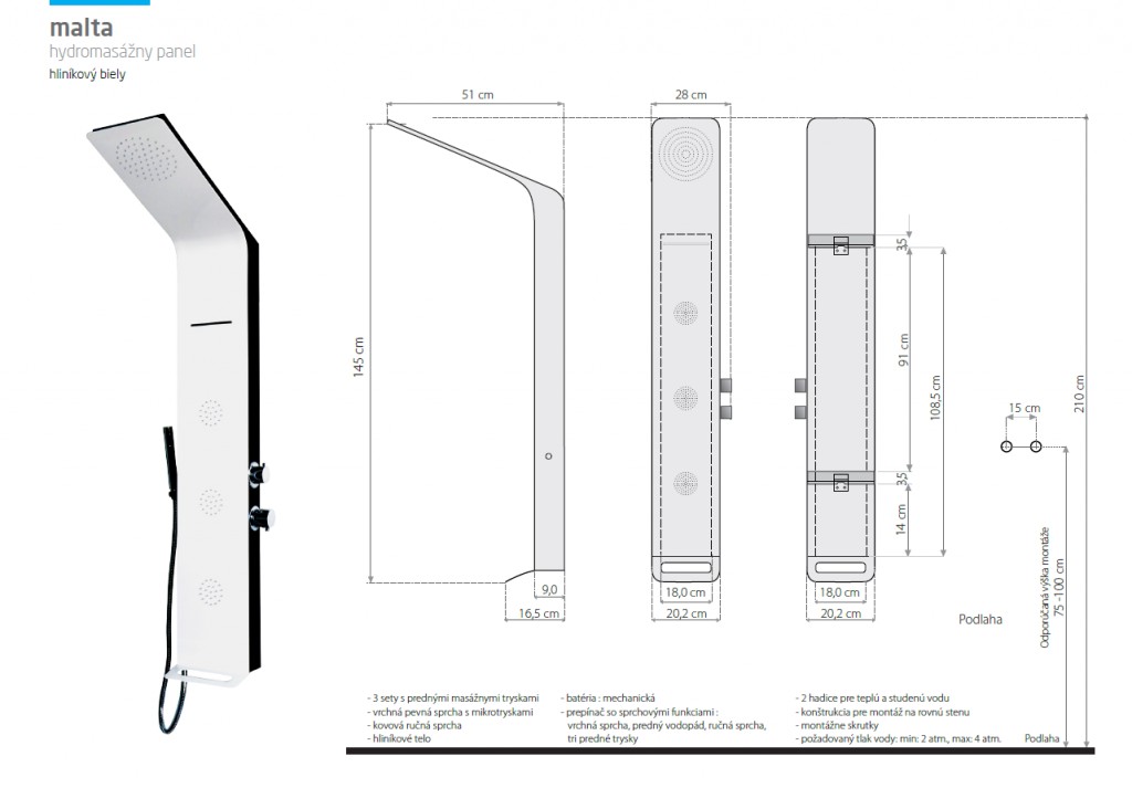 Také prostřednictvím hydromasážního panelu vytvoříte luxusní sprchovací prostor. Hydromasážní sprchové panely mají vrchní sprchu, která je pevná a spodní sprchu, která je spojena s panelem chromovou flexibilní hadicí a ručně nastavitelné trysky. Funkce panelu se programují pomocí regulátoru. Silnějším pootočením se otevírá a zavírá přívod vody, slabším pootočením se mění jednotlivé fukce. K montáži nepotřebujete žádné speciální zařízení. Jednoduše ho připojíte flexibilními hadicemi na přívod teplé a studené vody.