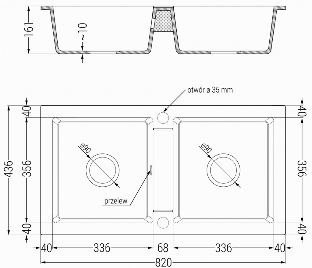 - odtokový otvor: 3,5 ”; fi = 90 mm