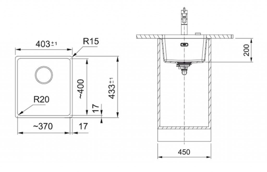 - dřez 370 x 400 x 200 mm (rádius 15 mm)