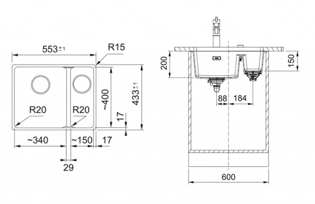 - menší dřez: 150 × 400 × 150 mm