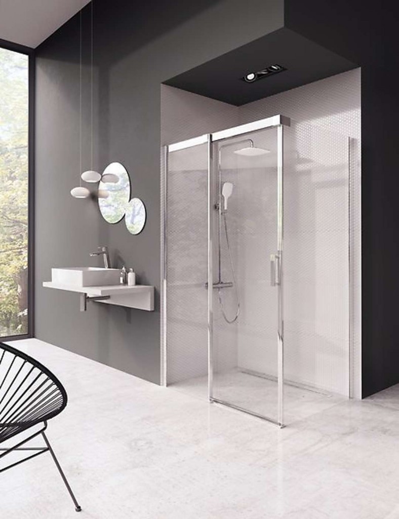 Sprchový kout se skládá z dvoudílných sprchových dveří - s jedním pevným dílem a s jedním pohyblivým, který tvoří posuvné dveře, a z pevné stěny. Levá nebo pravá varianta výrobku je dána směrem otevírání posuvných dveří při pohledu zvenku.