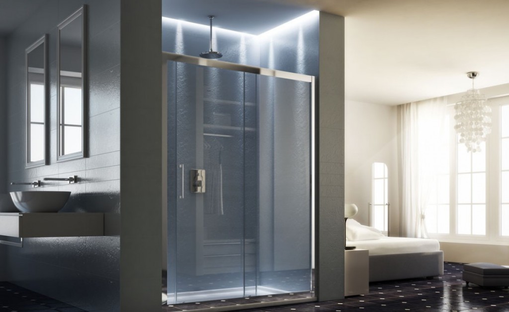 Posuvné skleněné stěny řeší atypické vstupy v prostorných koupelnách. Vytváří velmi luxusní dojem, který je podpořen výrazným chromovým madlem. Dodává se v univerzálním provedení.