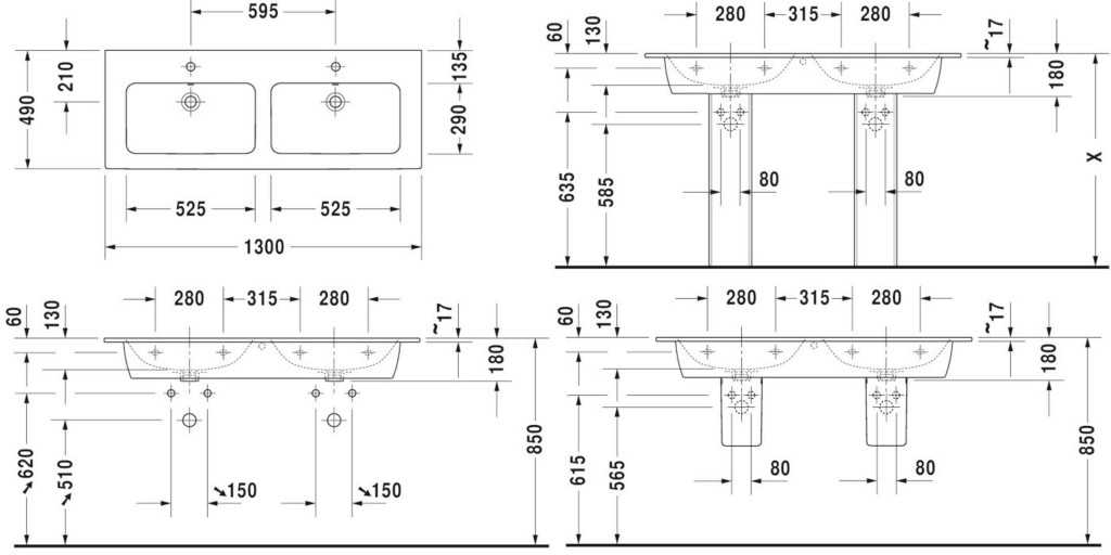 Při kombinaci se sloupem/polosloupem pro umyvadlo, je vždy třeba použít 2 ks. (viz. technický výkres)
