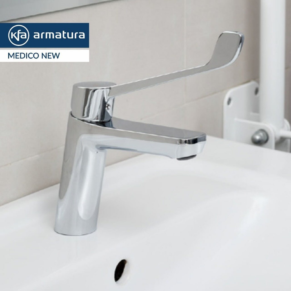 Stojánková umyvadlová baterie MEDICO NEW od výrobce KFA ARMATURA s keramickou kartuší s průměrem 35 mm a pevným ramínkem o délce 156 mm.