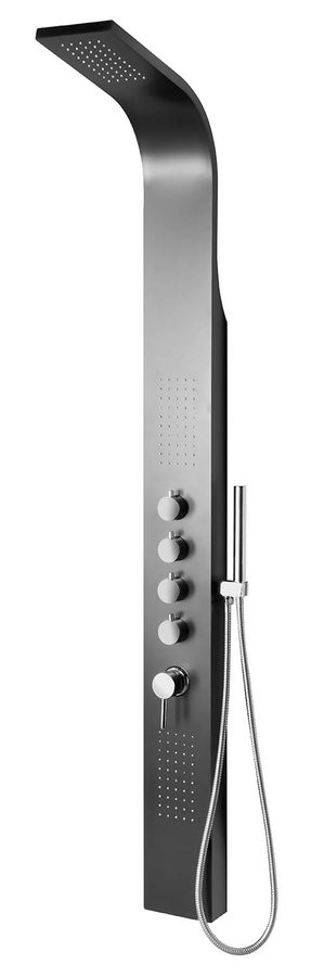 Sprchový kout v moderní koupelně dotváří elegantní sprchový panel, který oproti klasické baterii nabízí výběr proudu vody nejenom z ruční sprchy, ale i z hlavové sprchy a z bočních spršek. Sprchový hydromasážní panel MESA je vyroben z černě lakovaného hliníku. V jeho těle je zabudovaná páková baterie včetně ventilů pro volbu režimu sprchování. Panel je určen pro montáž na rovnou stěnu. Hlavová sprcha dokáže přímo nad vaší hlavou spustit dešťovou simulaci. Očistu pak dokončíte praktickou ruční sprchou, která je šikovně přichycená z boku.