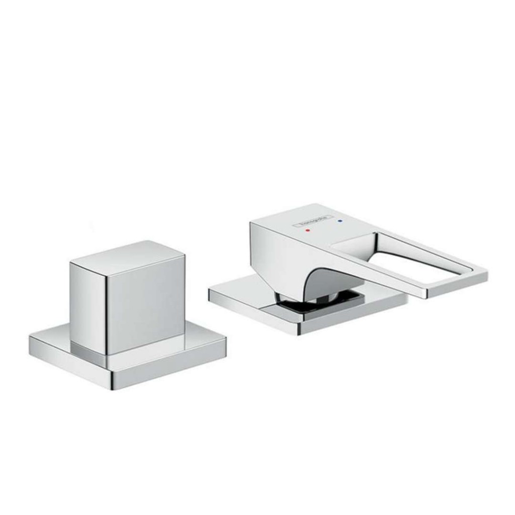 Dvouotvorová páková baterie na okraj vany s třmenovou rukojetí.