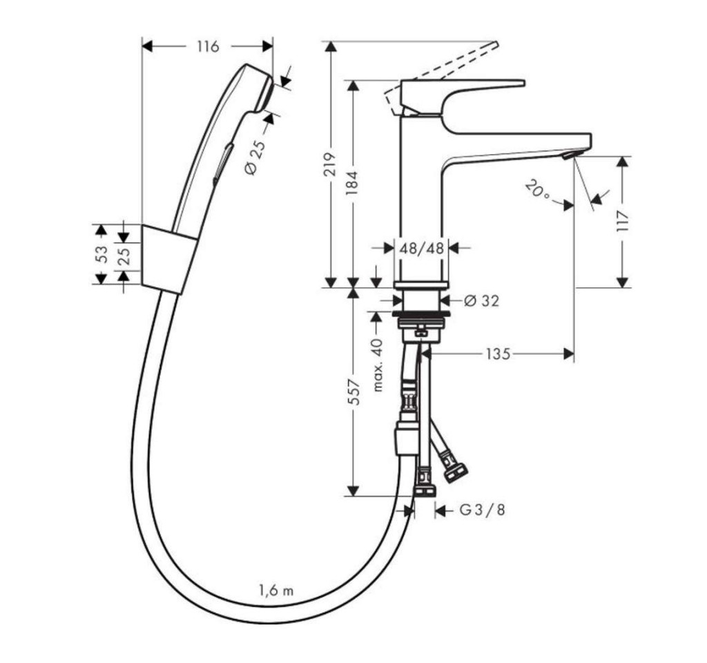 Páková umyvadlová baterie s ruční sprchou Bidette