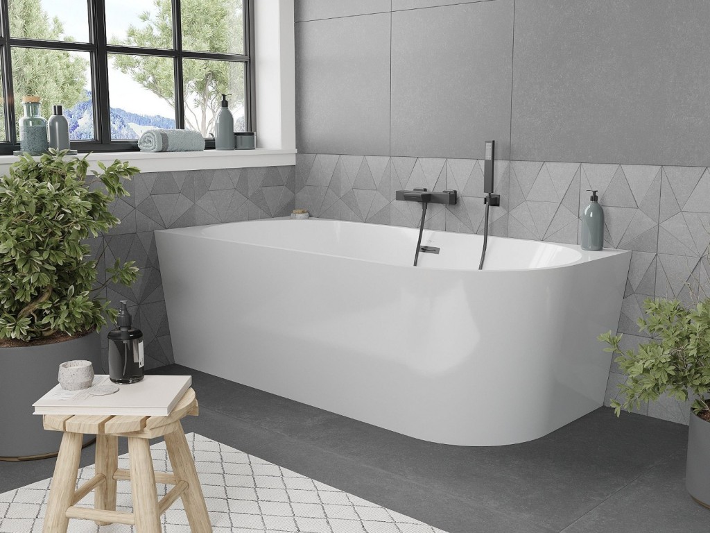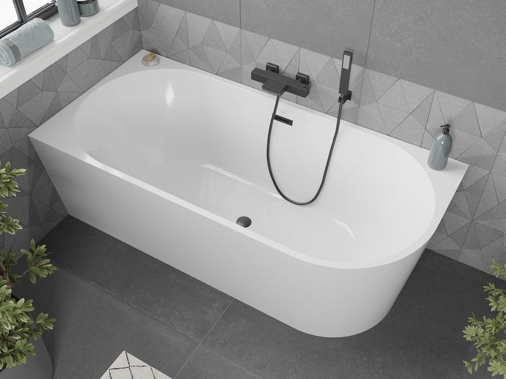 Volně stojící rohová vana MIA je určena k umístění ke stěně. Je to často luxusní a designový prvek, který přináší do koupelny elegantní a moderní vzhled. Volně stojící vany jsou často spojovány s luxusními koupelnami a nabízejí jedinečný zážitek z koupání.