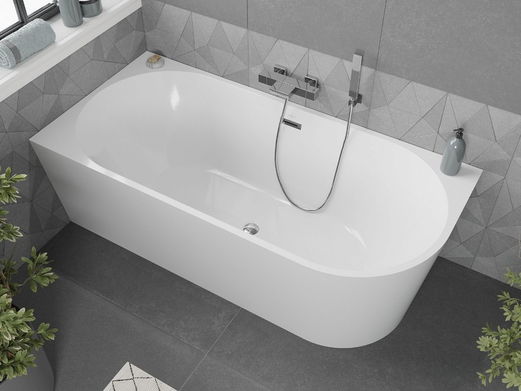 Volně stojící rohová vana MIA je určena k umístění ke stěně. Je to často luxusní a designový prvek, který přináší do koupelny elegantní a moderní vzhled. Volně stojící vany jsou často spojovány s luxusními koupelnami a nabízejí jedinečný zážitek z koupání.