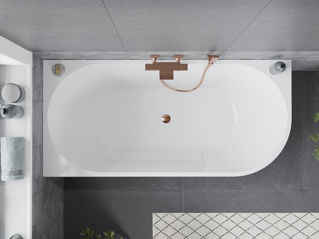 Mexen Mia je elegantní volně stojící rohová vana o rozměrech 150 x 75 cm vyrobená z kvalitního sanitárního akrylátu v klasické bílé barvě. Jeho jedinečný design s růžovým zlatem dodá každé koupelně luxusní charakter. Vana je odolná vůči zabarvení a UV záření a díky přepadovému otvoru a přiloženému sifonu a zacvakávací zátce je instalace jednoduchá a rychlá. Ideální volba pro lidi, kteří oceňují moderní styl a pohodlí.