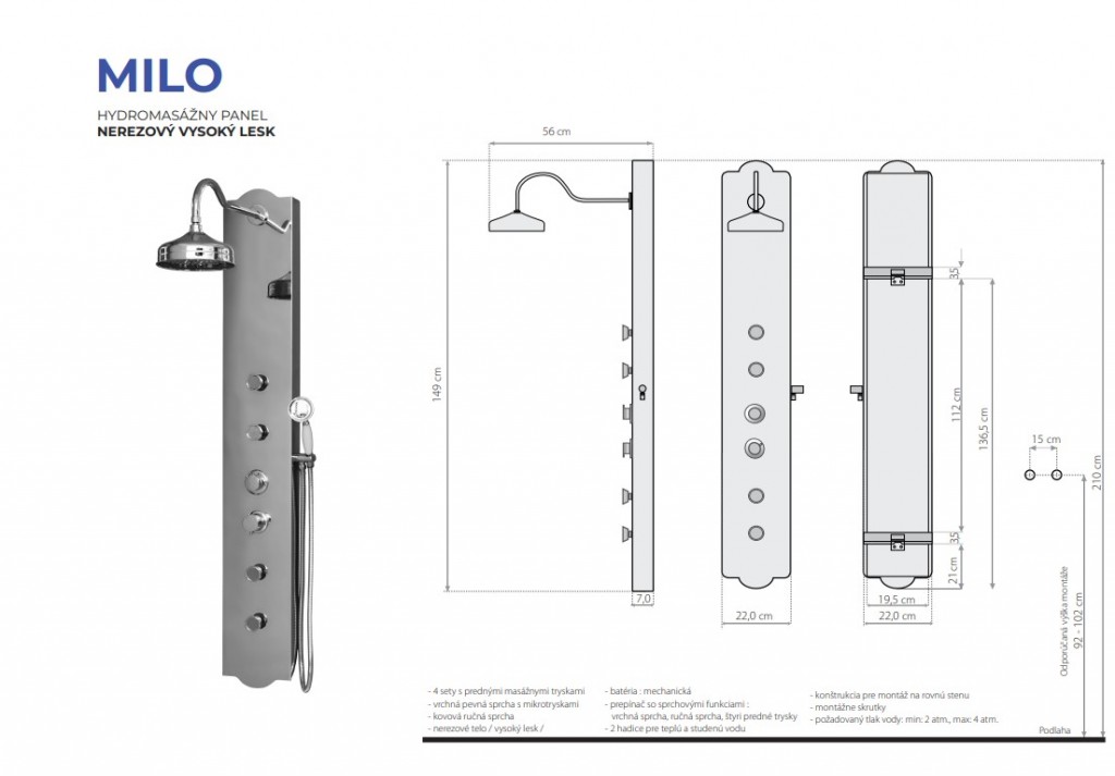 Také prostřednictvím hydromasážního panelu MILO vytvoříte luxusní sprchový prostor. Hydromasážní sprchové panely mají vrchní sprchu, která je pevná a spodní sprchu, která je spojena s panelem chromovou flexibilní hadicí a trysky. Funkce panelu se programují pomocí regulátoru. Silnějším pootočením se otevírá a zavírá přívod vody, slabším pootočením se mění jednotlivé funkce. K montáži nepotřebujete žádná speciální zařízení. Jednoduše jej připojíte flexibilními hadicemi pro přívod teplé a studené vody.