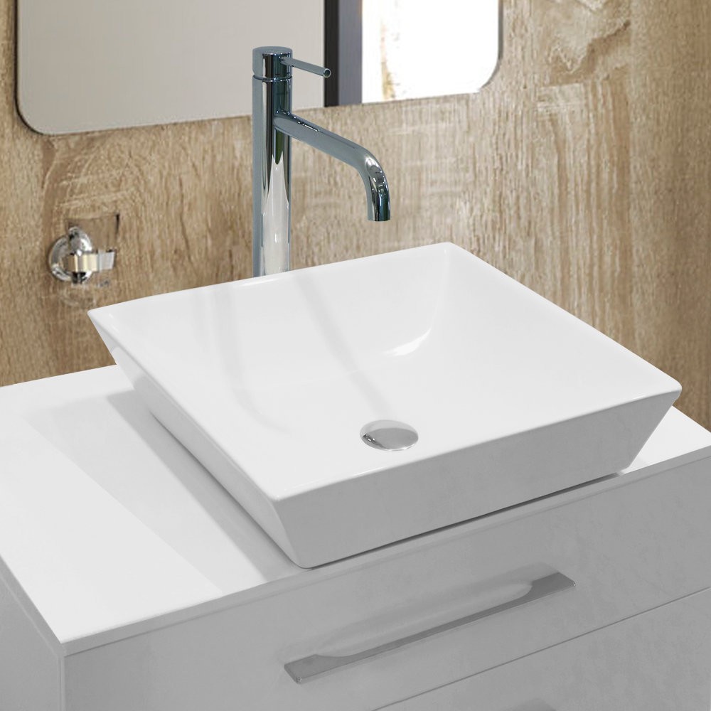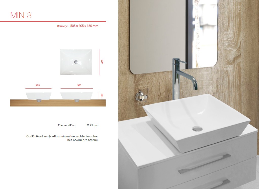 Hranaté keramické umyvadlo se zaoblenými rohy, bez otvoru pro baterii. Po stranách zkosené do úhlu.