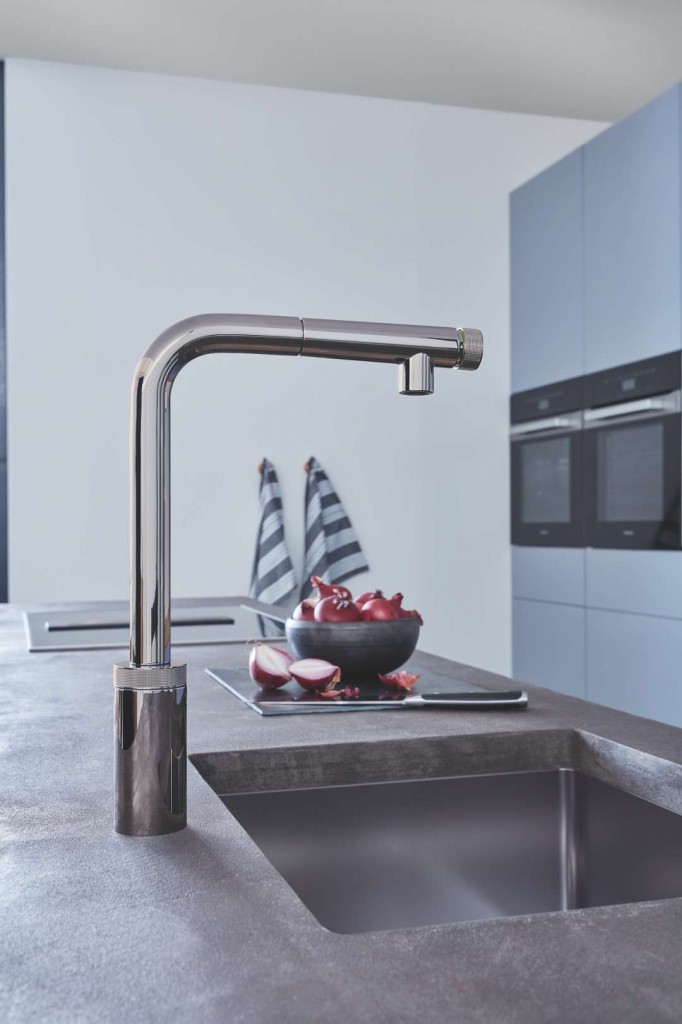 Baterie Minta SmartControl umožňuje regulaci proudu vody a její teploty jednou rukou. Vysoká výpusť usnadní plnění velkých hrnců a vytahovací sprška zvyšuje dosah použití baterie. Tato dřezová baterie také disponuje otočným ventilem pro regulaci objemu vody.