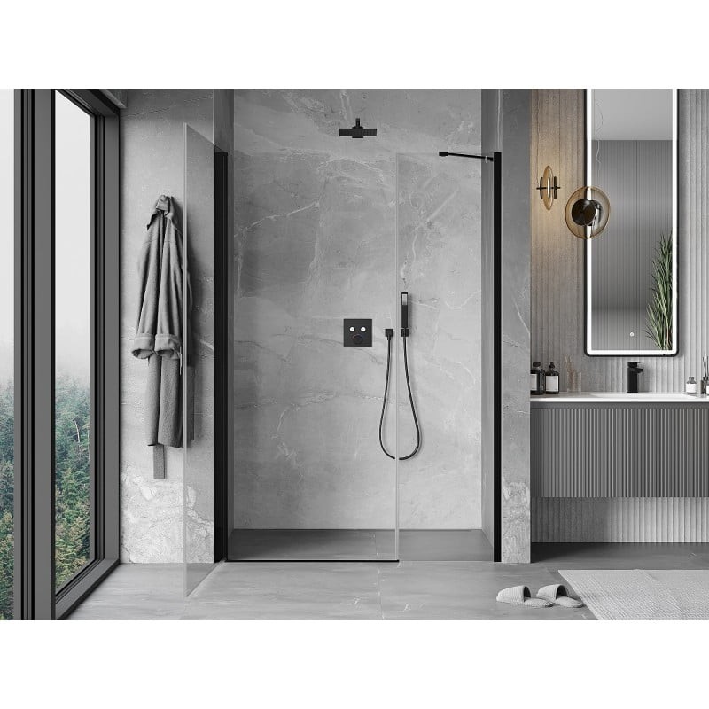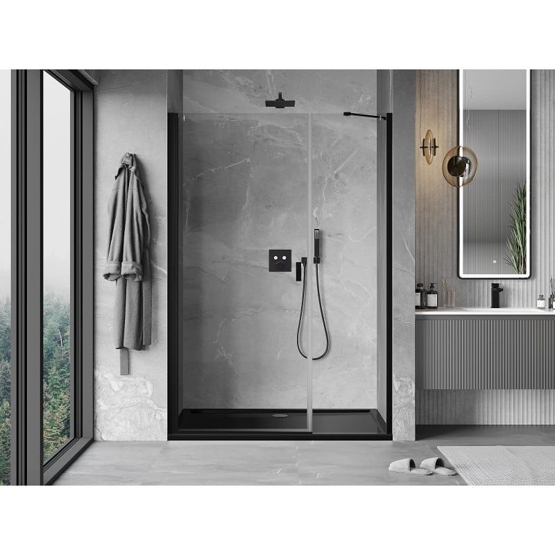 Specifikace produktu: Rozměr: 95x200 cm Strana montáže: Univerzální Vchod: Výklopný Barva skla: Průhledná Povrchová úprava: Černá Profil: Hliník Konzola: Nerezová ocel Typ skla: Tvrzené Tloušťka skla: 6 mm Povrchová úprava pro snadné čištění Nastavitelná šířka Možnost instalace na sprchovou vaničku nebo dlaždice Mechanismus zvedání a spouštění dveří Magnetický proužek a elastomerové těsnění pro odtok vody Hliníkový práh těsnění dveří