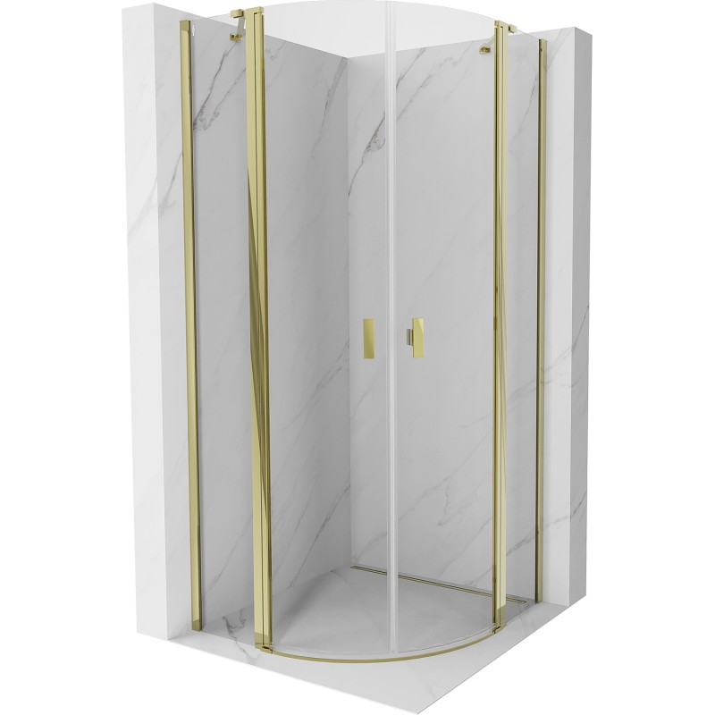 Specifikace produktu: Rozměr: 90x90 cm Výška: 200 cm Poloměr zakřivení R55 Strana montáže: Univerzální Vchod: Dveře s výklopnými křídly Barva skla: Průhledná Povrchová úprava: Zlatá Profil: Hliník Konzola: Nerezová ocel Typ skla: Tvrzené Tloušťka skla: 6 mm Povrchová úprava pro snadné čištění Nastavitelná šířka Možnost montáže na sprchovou vaničku nebo dlaždice Mechanismus zvedání a spouštění dveří Magnetický proužek a elastomerové těsnění pro odtok vody Hliníkový práh těsnění dveří