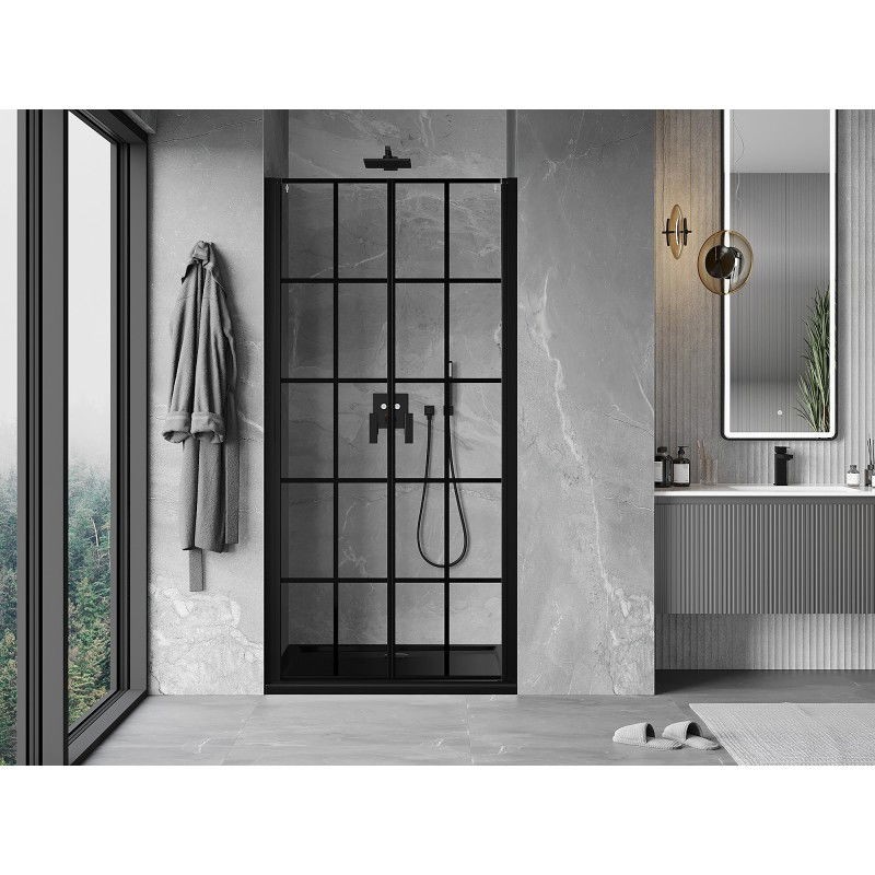 Specifikace produktu: Rozměr: 95x200 cm Strana montáže: Univerzální Vchod: Výklopný Barva skla: Černá mřížka Povrchová úprava: Černá Profil: Hliník Typ skla: Tvrzené Tloušťka skla: 6 mm Povrchová úprava pro snadné čištění Nastavitelná šířka Možnost instalace na sprchovou vaničku nebo dlaždice Mechanismus zvedání a spouštění dveří Magnetický proužek a elastomerové těsnění pro odtok vody Hliníkový práh těsnění dveří