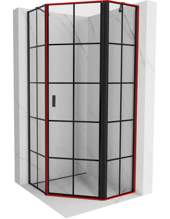 Dveřní část MIST (pevná stěna + křídlové dveře) je vyrobena z 6mm tvrzeného skla s černými dekorativními pruhy v elegantním černém provedení.