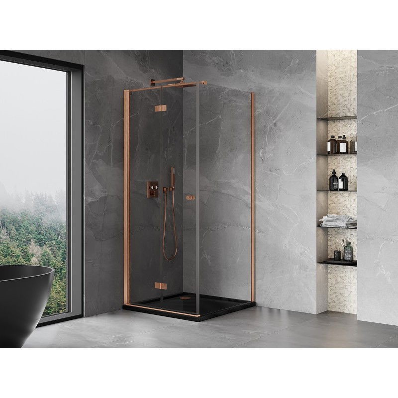 Specifikace produktu: Rozměr: 90x90 cm (levé dveře 90 cm, stěna 90 cm) Výška: 200 cm Strana montáže: Levá Vchod: Skládací dveře Barva skla: Průhledná Povrchová úprava: Kartáčovaná měď Profil: Hliník Konzola: Nerezová ocel Max. délka konzoly: 150 cm Konzolu lze řezat Typ skla: Tvrzené Tloušťka skla: 6 mm Povrchová úprava pro snadné čištění Nastavitelná šířka Možnost montáže na sprchovou vaničku nebo dlaždice Mechanismus pro zvedání a spouštění dveří Mosazné panty v jedné rovině se sklem Magnetický proužek a elastomerové těsnění pro odvod vody Hliníkový práh těsnění dveří