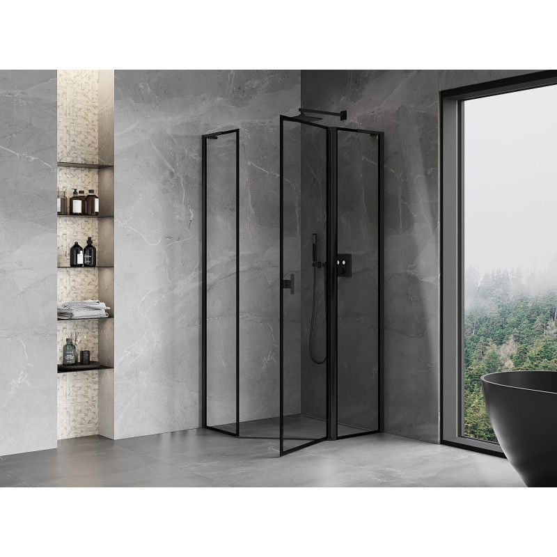 Specifikace produktu: Rozměr: 100x100 cm (pravé dveře 100 cm, stěna 100 cm) Výška: 200 cm Strana montáže: Pravá Vchod: Dveře s výklopnými křídly Barva skla: Černý rám Povrchová úprava: Černá Profil: Hliník Úhlový stabilizátor L: Nerezová ocel Typ skla: Tvrzené Tloušťka skla: 6 mm Povrchová úprava pro snadné čištění Nastavitelná šířka Možnost montáže na sprchovou vaničku nebo dlaždice Mechanismus pro zvedání a spouštění dveří Magnetický proužek a elastomerové těsnění pro odtok vody Hliníkový práh těsnění dveří