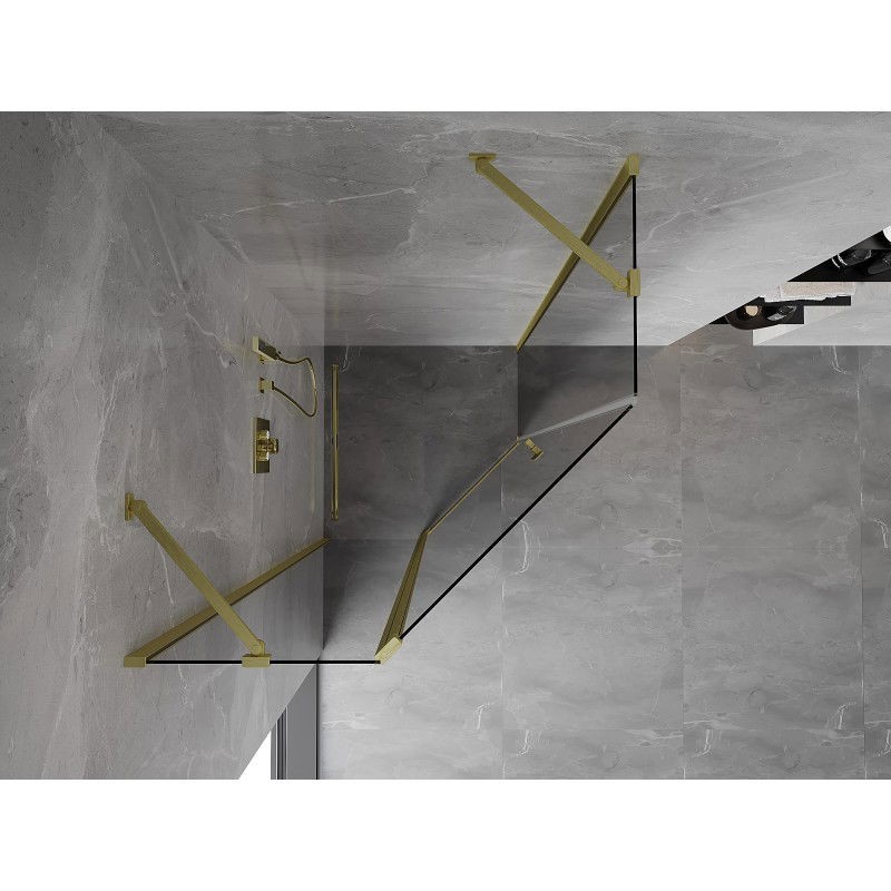 Specifikace produktu: Rozměr: 100x100 cm (dveře 100 cm, stěna 100 cm) Výška: 200 cm Strana montáže: Univerzální Vchod: Dveře s výklopnými křídly Barva skla: Průhledná Povrchová úprava: Kartáčované zlato Profil: Hliník Konzola: Nerezová ocel Typ skla: Tvrzené Tloušťka skla: 6 mm Povrchová úprava pro snadné čištění Nastavitelná šířka Možnost montáže na sprchovou vaničku nebo dlaždice Mechanismus zvedání a spouštění dveří Magnetický proužek a elastomerové těsnění pro odtok vody Hliníkový práh těsnění dveří