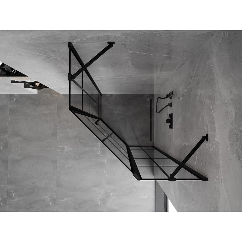 Specifikace produktu: Rozměr: 100x100 cm (pravé dveře 100 cm, stěna 100 cm) Výška: 200 cm Strana montáže: Pravá Vchod: Dveře s výklopnými křídly Barva skla: Černá mřížka Povrchová úprava: Černá Profil: Hliník Konzola: Nerezová ocel Typ skla: Tvrzené Tloušťka skla: 6 mm Povrchová úprava pro snadné čištění Nastavitelná šířka Možnost montáže na sprchovou vaničku nebo dlaždice Mechanismus zvedání a spouštění dveří Magnetický proužek a elastomerové těsnění pro odtok vody Hliníkový práh těsnění dveří
