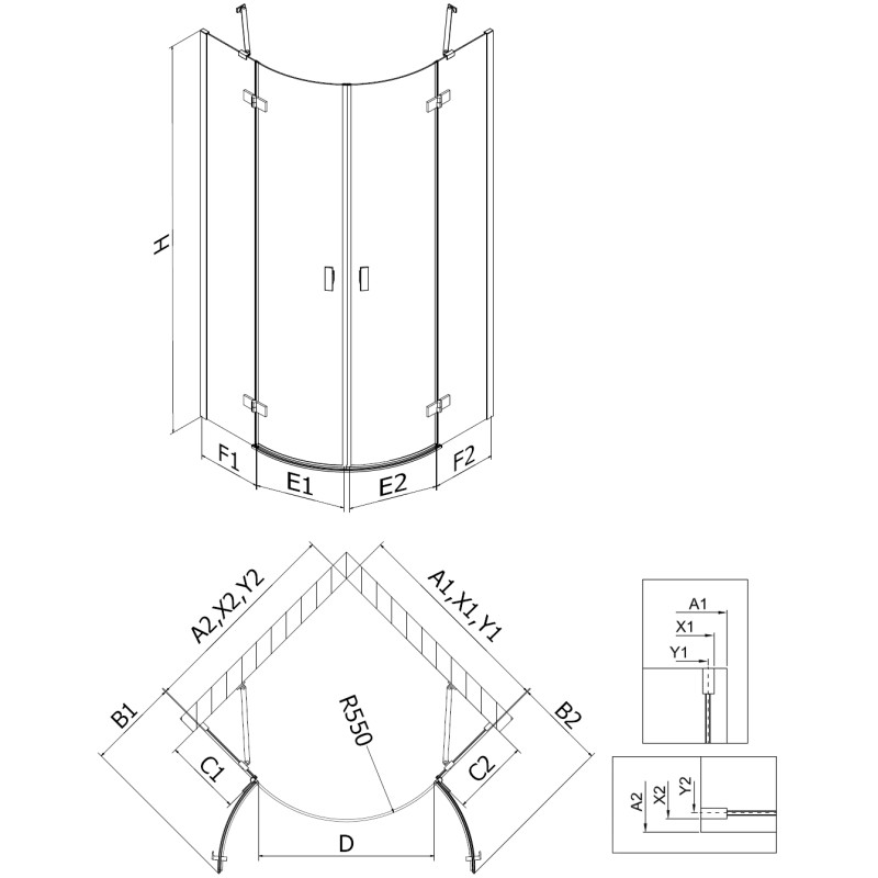 Specifikace produktu: Rozměr: 90x90 cm Výška: 200 cm Poloměr zakřivení R55 Strana montáže: Univerzální Vchod: Dveře s výklopnými dveřmi Barva skla: Průhledná Povrchová úprava: Černá Profil: Hliník Konzola: Nerezová ocel Typ skla: Tvrzené Tloušťka skla: 6 mm Povrchová úprava pro snadné čištění Nastavitelná šířka Možnost instalace na sprchovou vaničku nebo dlaždice Mechanismus pro zvedání a spouštění dveří Mosazné panty v jedné rovině se skleněnou tabulí Magnetický proužek a elastomerové těsnění pro odvod vody Hliníkový práh těsnění dveří