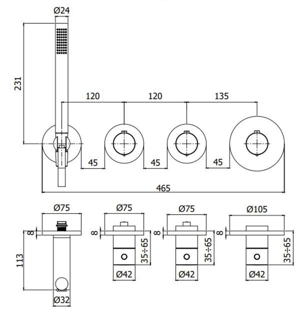 Termostatická podomítková baterie, čtyřotvorová instalace, bez tělesa