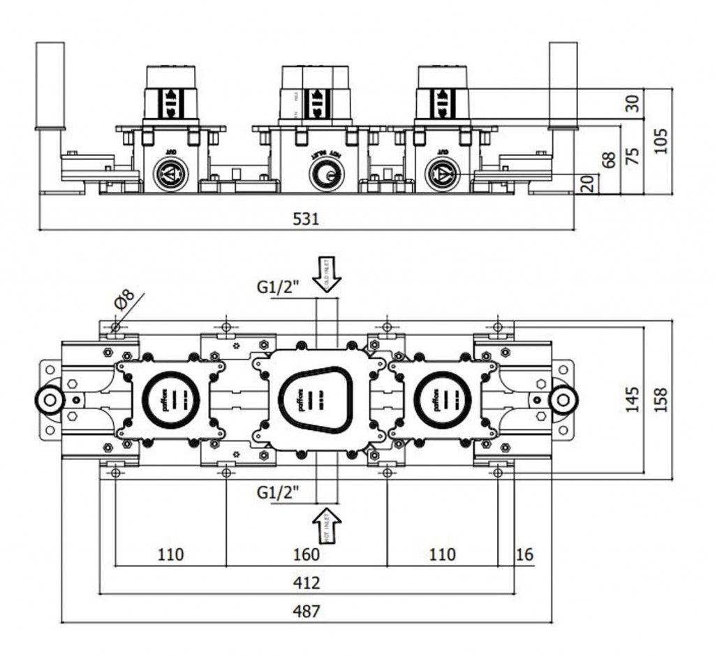 - součástí balení je podomítkové těleso, instalační krabice, připojení pro sprchový set a vpusť