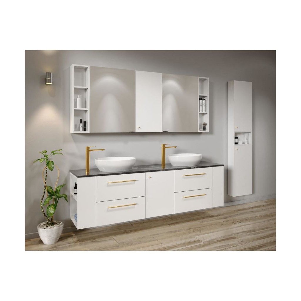Koupelnový nábytek LARGA je dostupný ve třech barevných variantách: bílá, šedá a modrá, které lze konfigurovat s pracovními deskami různých barev. Nábytek doplňují kovové úchytky, knoflíky a nohy ve zlaté, černé a stříbrné barvě.