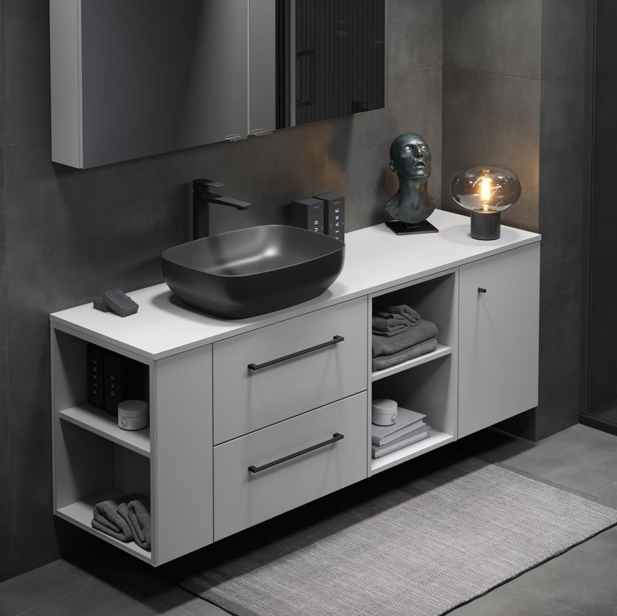 Koupelnový nábytek LARGA je dostupný ve třech barevných variantách: bílá, šedá a modrá, které lze konfigurovat s pracovními deskami různých barev. Nábytek doplňují kovové úchytky, knoflíky a nohy ve zlaté, černé a stříbrné barvě.