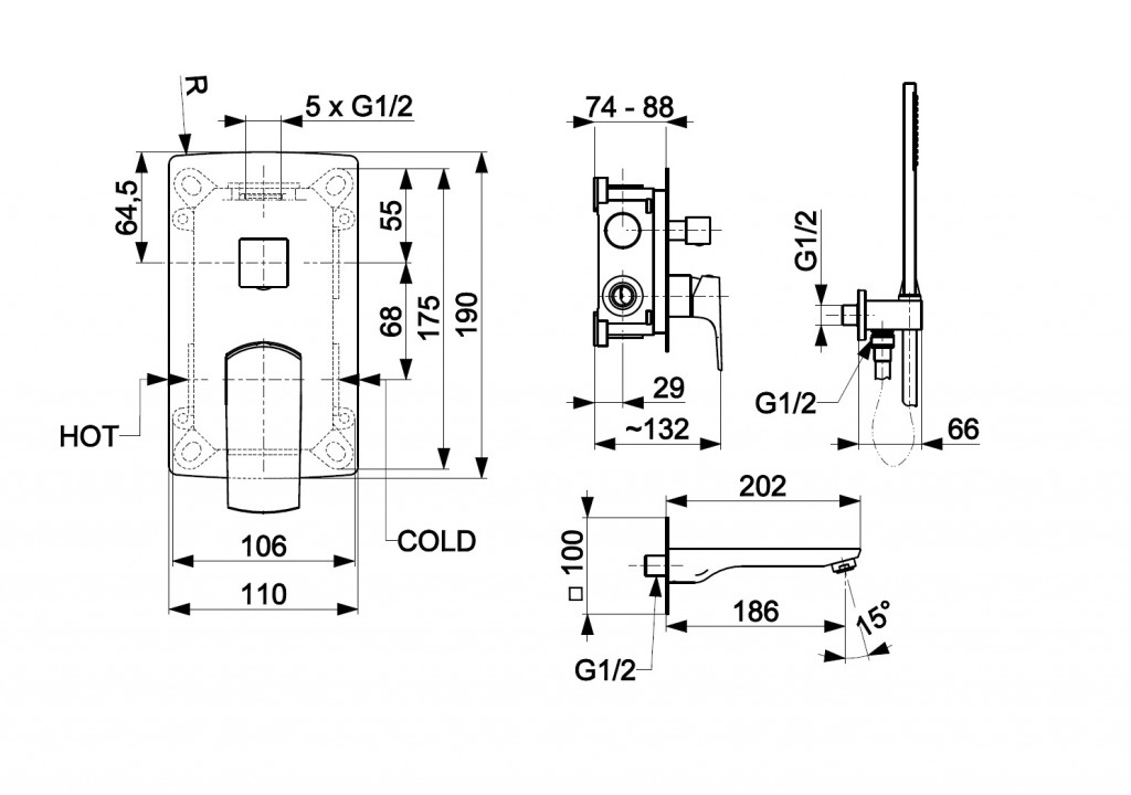- úhlové připojení na stěnu s držákem na ruční sprchu