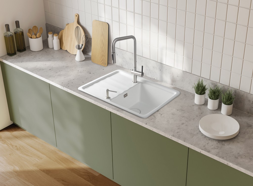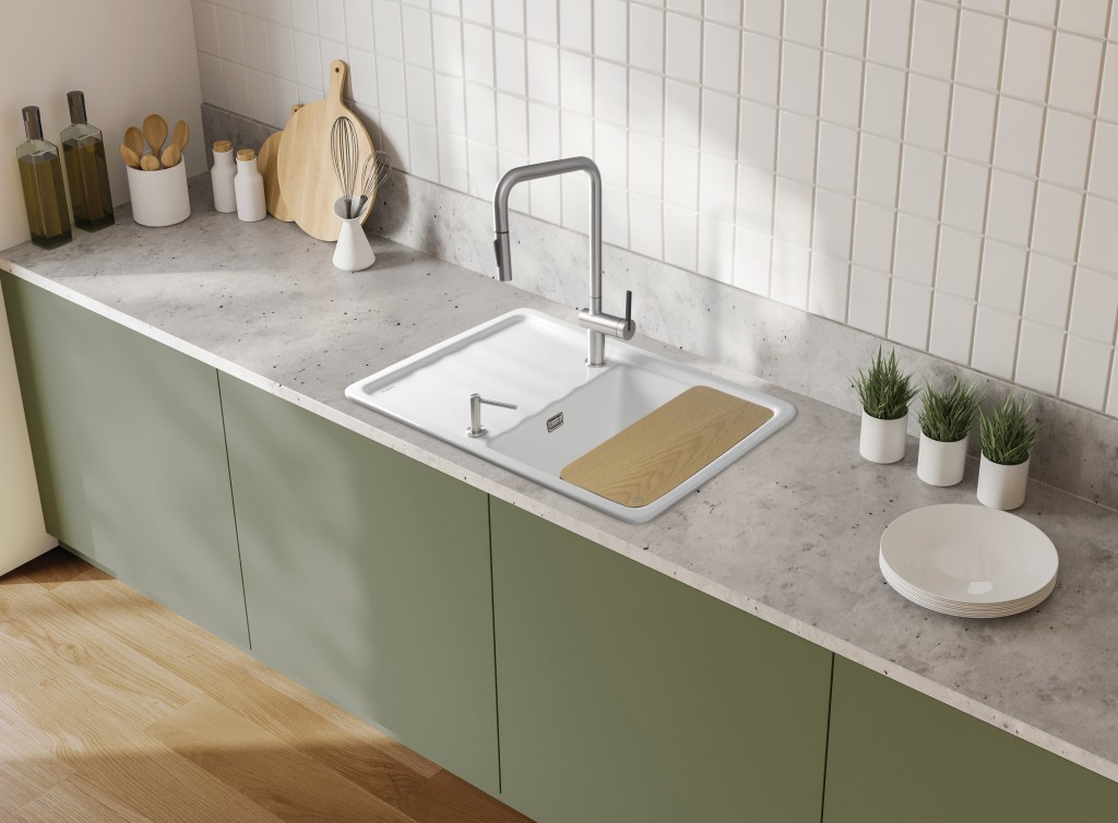 Jednomiskový dřez s odkapávačem série MOMI je vyroben je vyroben z kvalitní keramiky. Díky tomu odolává vysokým teplotám a jejich rychlým změnám. Navíc časem neztrácí barvu a tlumená elegantní barva se skvěle hodí k ostatním prvkům výbavy. Odkapávač slouží k odkládání umytého nádobí nebo zeleniny, profilovaný povrch účinně odvádí stékající vodu. Sada obsahuje prostorově úsporný sifon Space-Saver, který umožňuje vytvořit ve skříni další místo pro koš na třídění odpadu nebo čisticí prostředky.