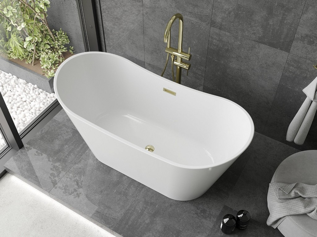 Volně stojící oválná akrylátová vana série MONTANA od výrobce MEXEN s přepadem a umístěném odpadu na středu vany.