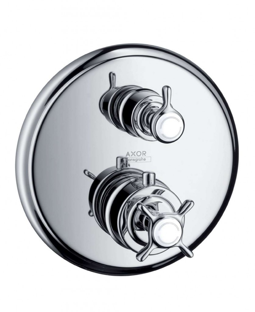 vrchní sada obsahuje: kovovou rozetu, rukojeť, objímku, instalační blok, keramický ventil, termoregulační prvek, mísicí jednotku
