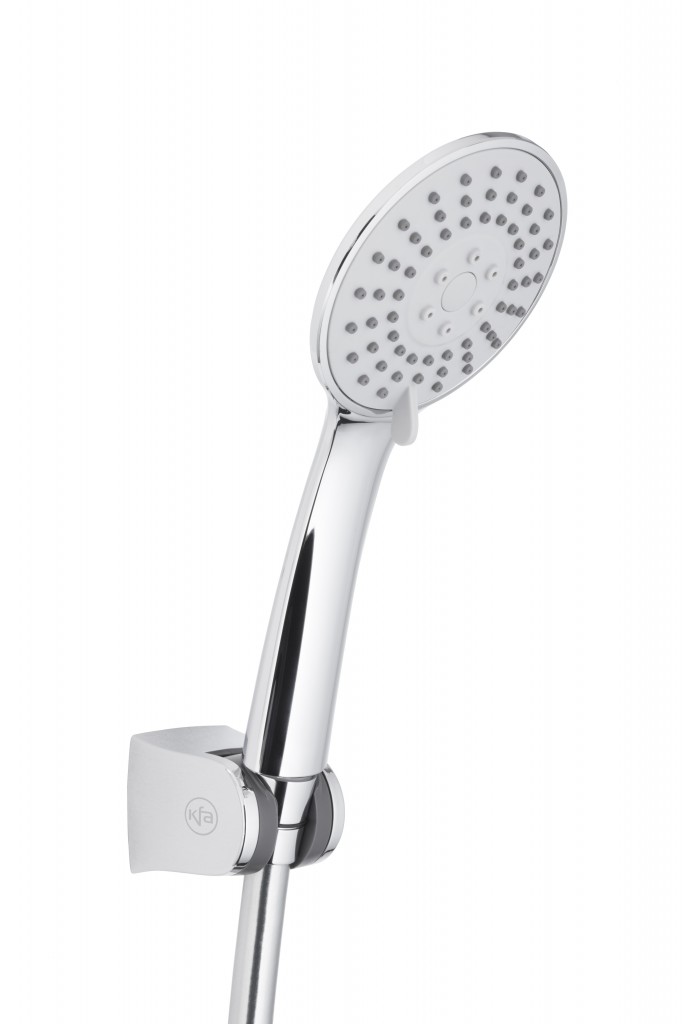 Plastová ruční sprcha MOZA od výrobce KFA se třemi funkcemi a standardním připojením G 1/2". Její povrh je opatřen povlakem, který soupravu ochrání proti korozi a je odolný při běžném používání. Součástí jednobodový kloubový držák.