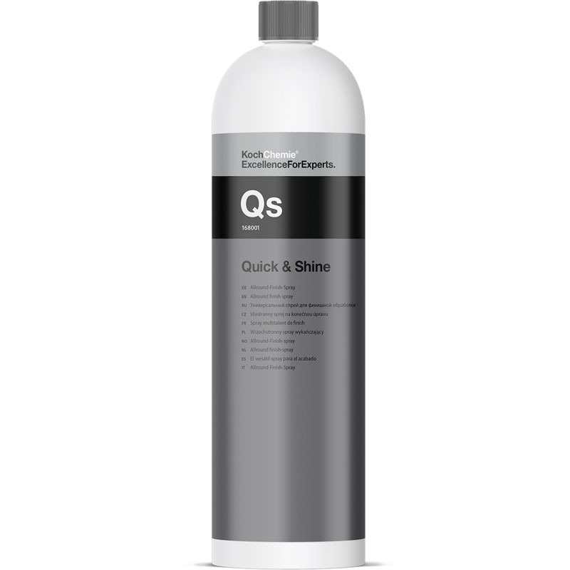 Popis přípravku: Quick & Shine je multifunkční přípravek na čištění všech lakovaných povrchů, umělých hmot (nárazníky, kokpity), skleněných vysokojakostních ploch, v automobilovém průmyslu, vhodný také pro motorky a na dřevěný a ušlechtilý nábytek. Čistí, udržuje, chrání a konzervuje v jednom pracovním procesu. Ošetřené povrchy získají vysoký lesk a hladkost beze šmouh. Otisky prstů a lehká znečištění budou rychle a jednoduše odstraněna. Případné dřívější nanesené politury a udržovací přípravky nebudou odstraněny. Přípravek je ideální pro prezentaci vozidel na výstavách (ve výstavních místnostech) díky svému rychlému a jednoduchému použití.