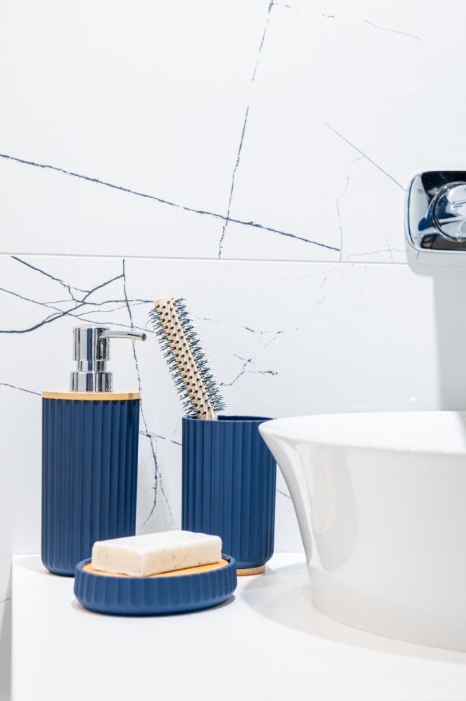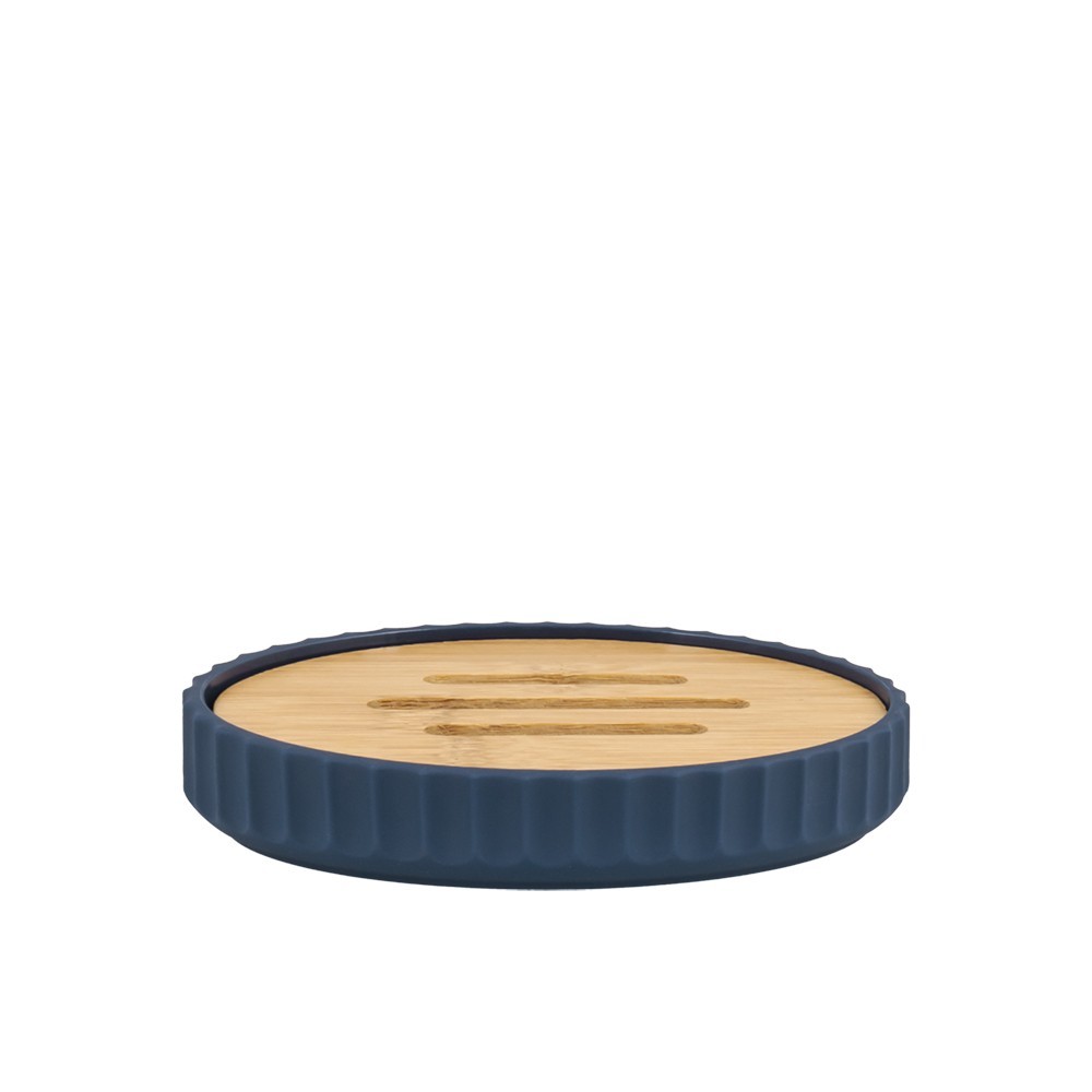 Stylová miska na mýdlo s odkapávačem ze série Andora. Vyrobeno z materiálu příjemného na dotek v tmavě modré barvě. Dekorativní prvky z pravého bambusu dodávají přirozené kouzlo. Praktický a snadno se udržuje v čistotě.