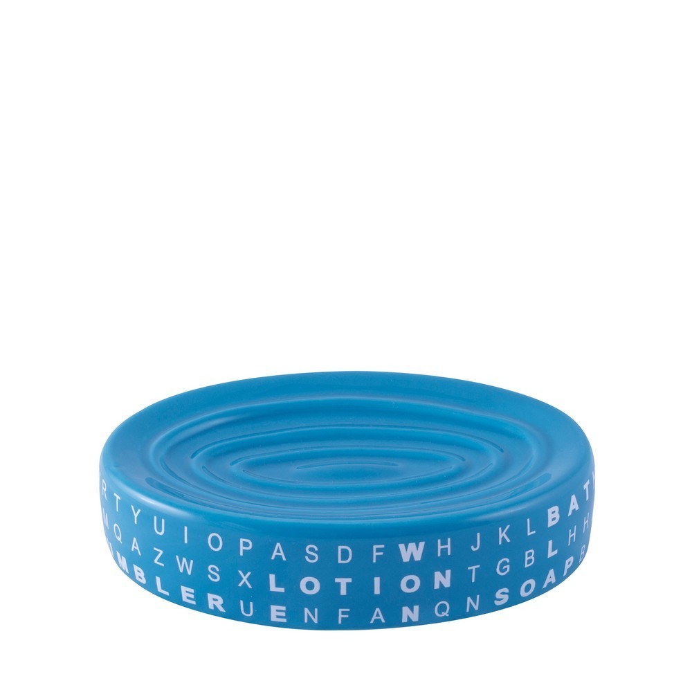 Moderní miska na mýdlo ze série ENZO. Jeho modré pouzdro má stylové bílé písmo.