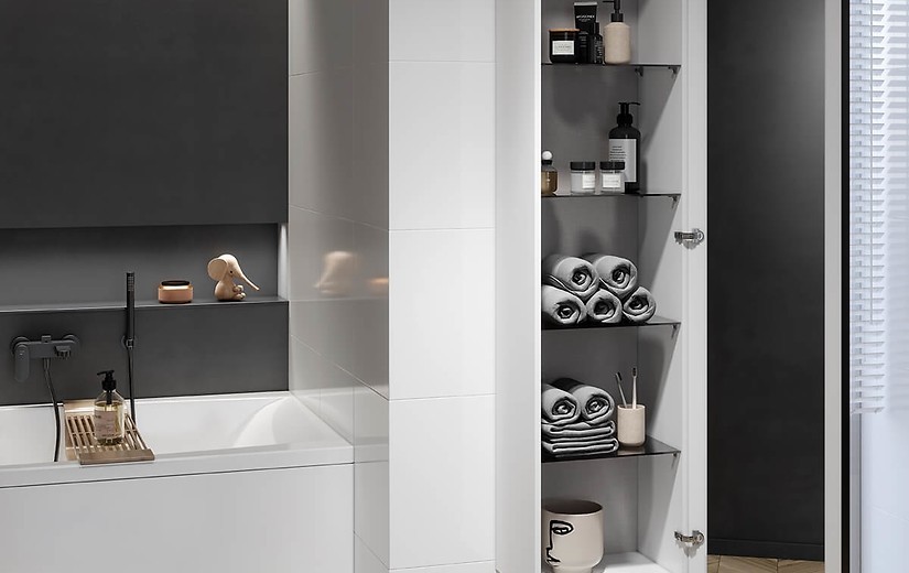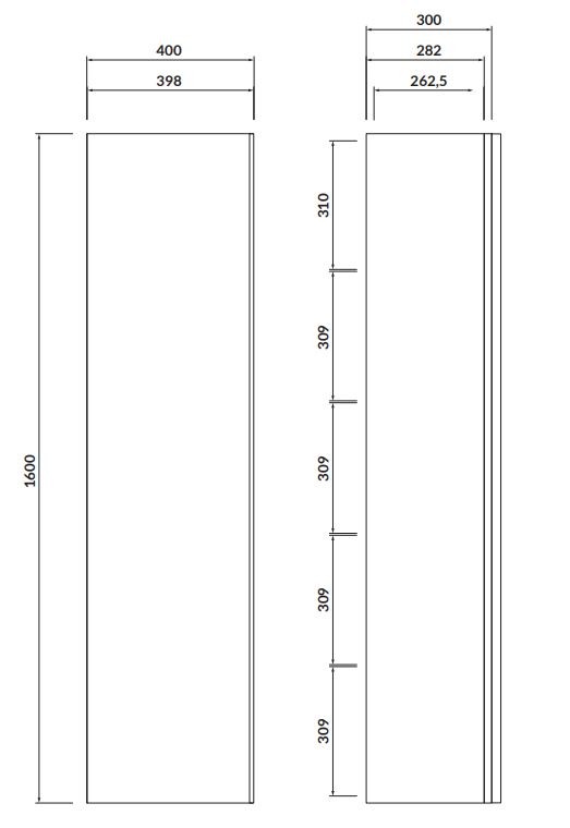 Závěsný elegantní vysoký sloupek VIRGO je vyroben z bílé lakované dřevotřískové desky s lesklým povrchem. Nábytková dvířka jsou vybavena praktickými panty se systémem „soft-close“ se širokým úhlem otevření - až 165 stupňů. Díky tomu lze snadno použít velké zrcadlo umístěné na vnitřní straně dveří. Uvnitř sloupku jsou 4 police z kouřového tvrzeného skla a povrch zadní části skříně je pokryt jemnou šedou lněnou strukturou.