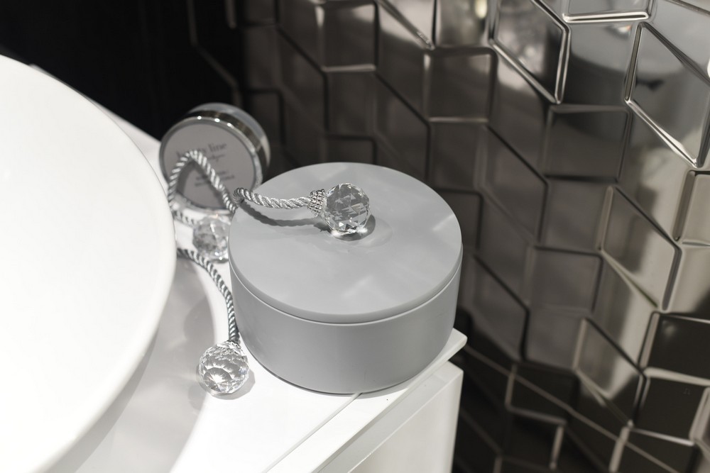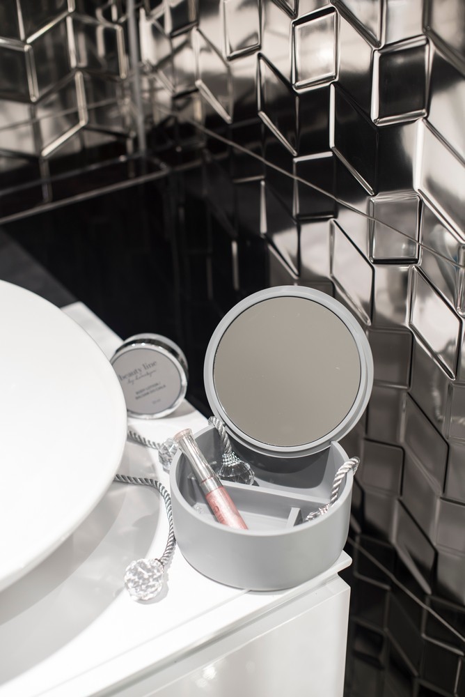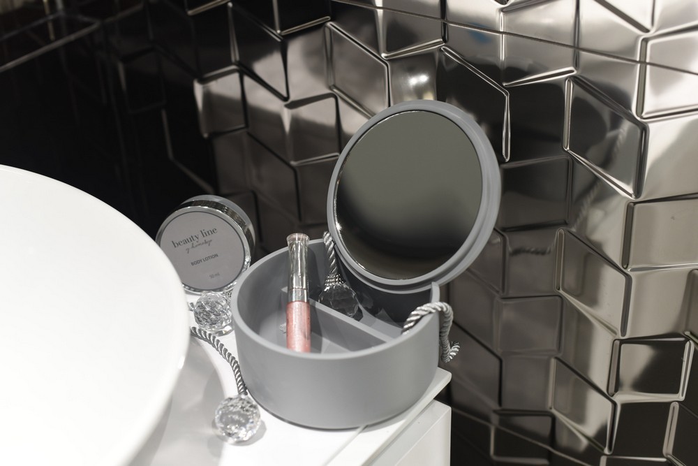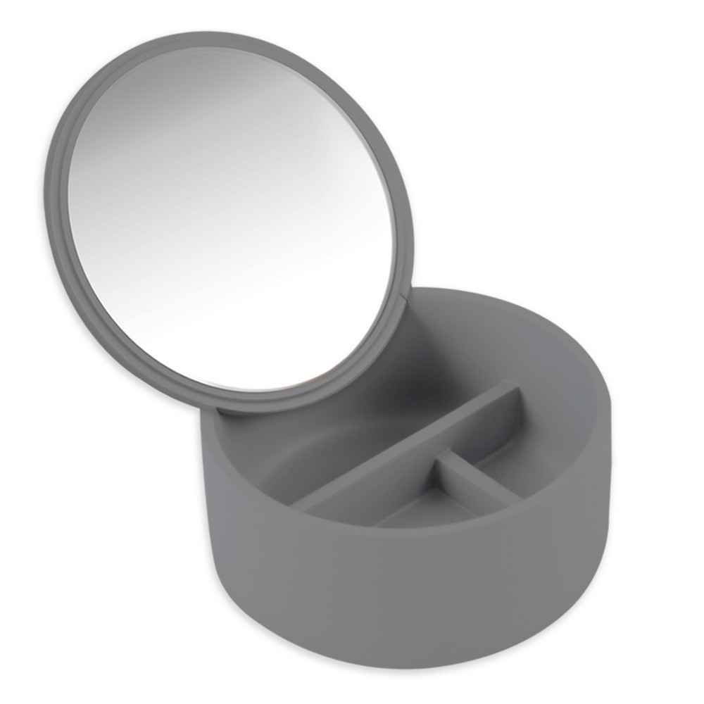 Praktická šedá nádoba se zrcátkem. Víko nádoby je opatřeno zrcátkem, které lze pohodlně umístit na speciálně připravené místo v nádobě. Uvnitř jsou přihrádky např. na šperky. Ideální do koupelny i na toaletní stolek.