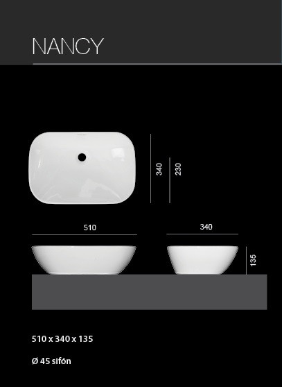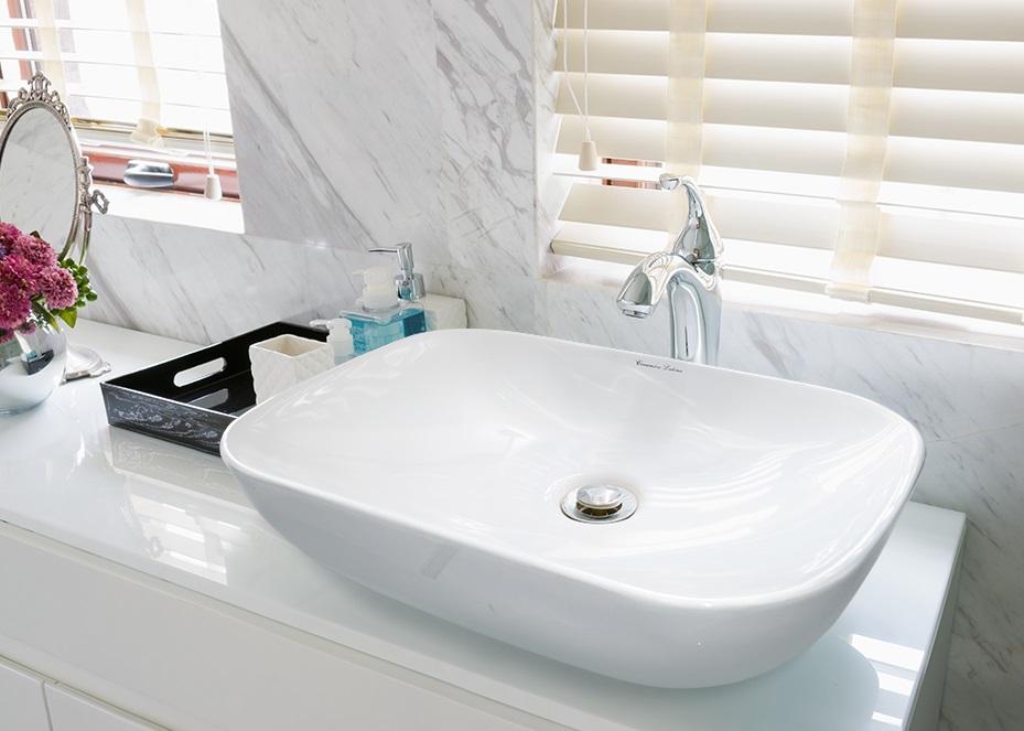 Masivní keramické umyvadlo se zaoblenými rohy bez otvoru pro baterii.