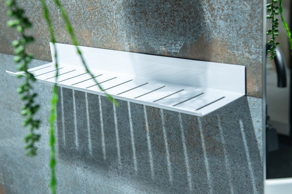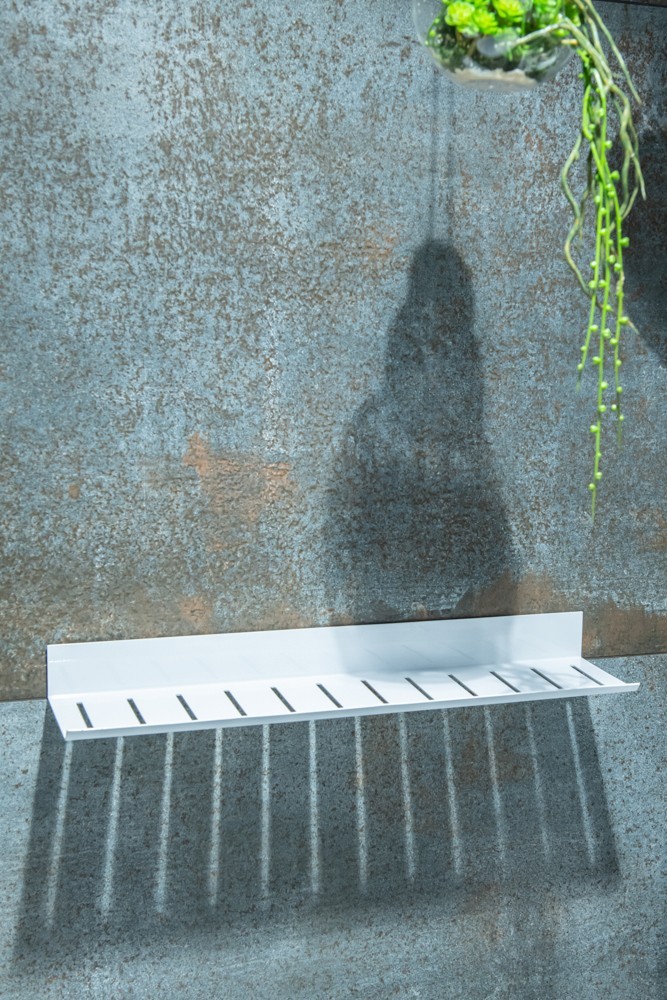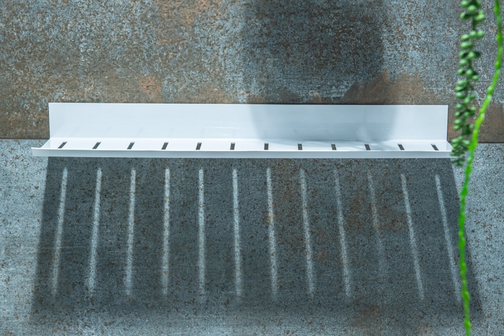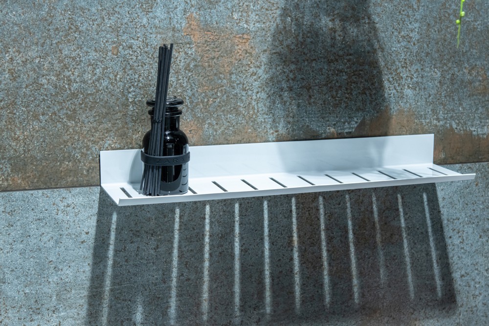 Dlouhá koupelnová polička z bíle lakovaného hliníku s lesklou povrchovou úpravou. Instalace probíhá na samolepicí 3M pásku s vysokou lepicí silou. Jeho maximální nosnost je 4 kg.