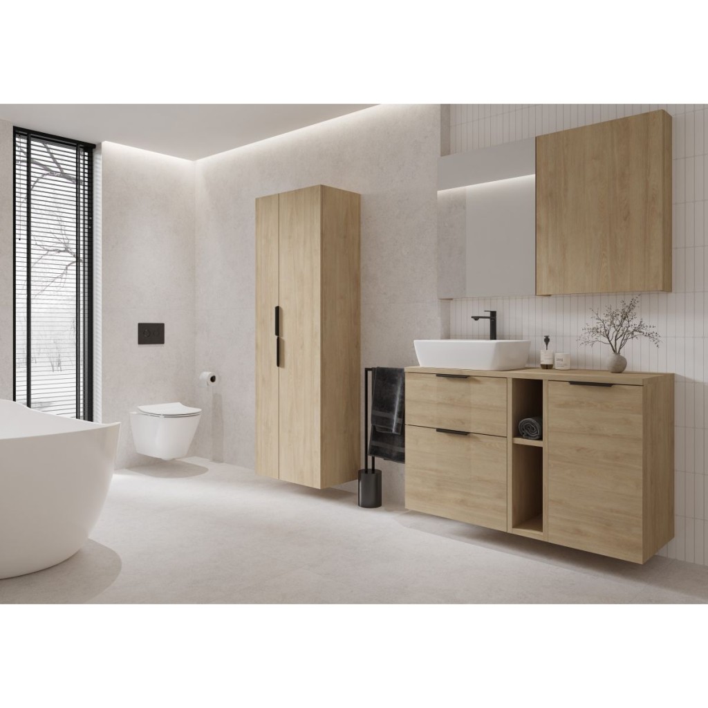 Nástěnná skříňka s nábytkovým čelem je ideálním řešením pro přehledné uložení drobné kosmetiky či koupelnových doplňků. Uvnitř se nacházejí tři praktické police, které umožňují efektivní organizaci prostoru. Skříňka je vybavena bezúchytkovým otevíráním dvířek a systémem tlumeného zavírání pro tichý a komfortní provoz. Čelo i korpus jsou vyrobeny z odolné laminované dřevotřísky, která zajišťuje dlouhou životnost a snadnou údržbu.