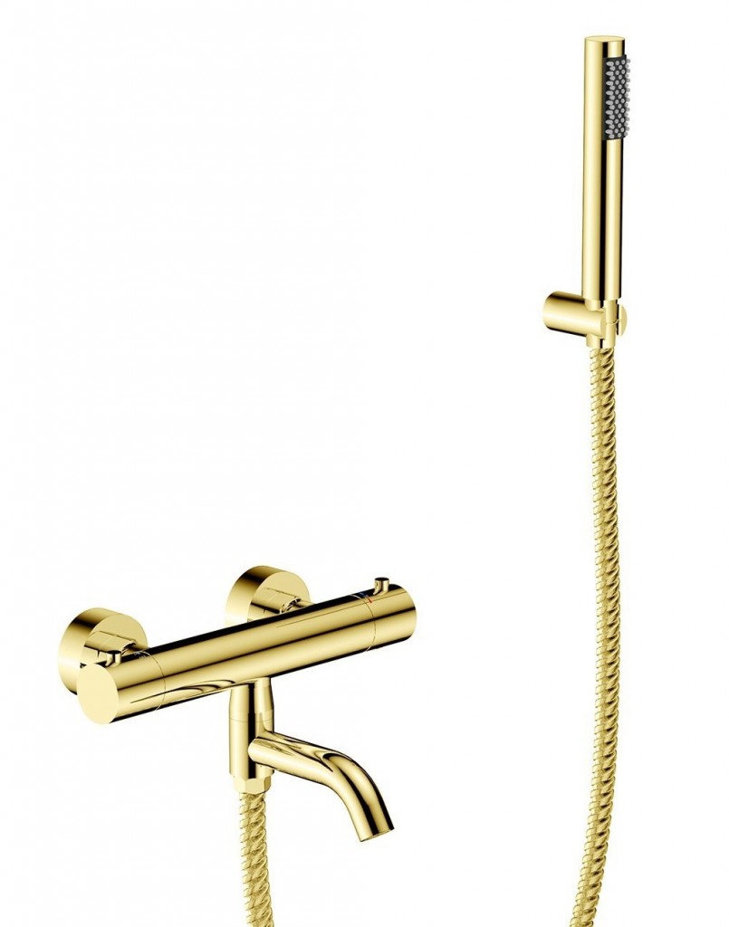 Jedinečný nástěnný sprchový i vanový termostatický set s příslušenstvím VEO zlatá barva. Kompletní řešení pro vaši koupelnu. Set obsahuje termostatickou baterii, vývod ze stěny s držákem, ruční sprchu a hadici. Dodáváme v šesti barvách a to lesklý chrom, černá, grafitová, zlatá, zlatá broušená nebo zlatá lesklá.